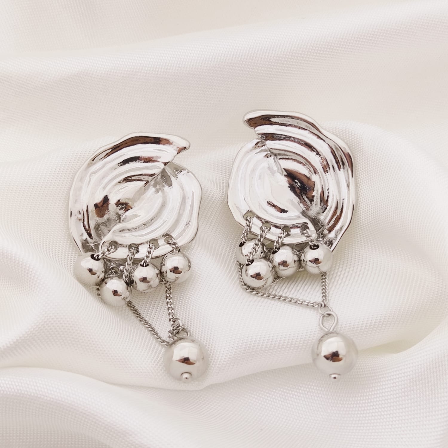 ARETE MEDIOS DISCOS CON TEXTURA CON 5 BOLAS TEJIDAS CON CADENA