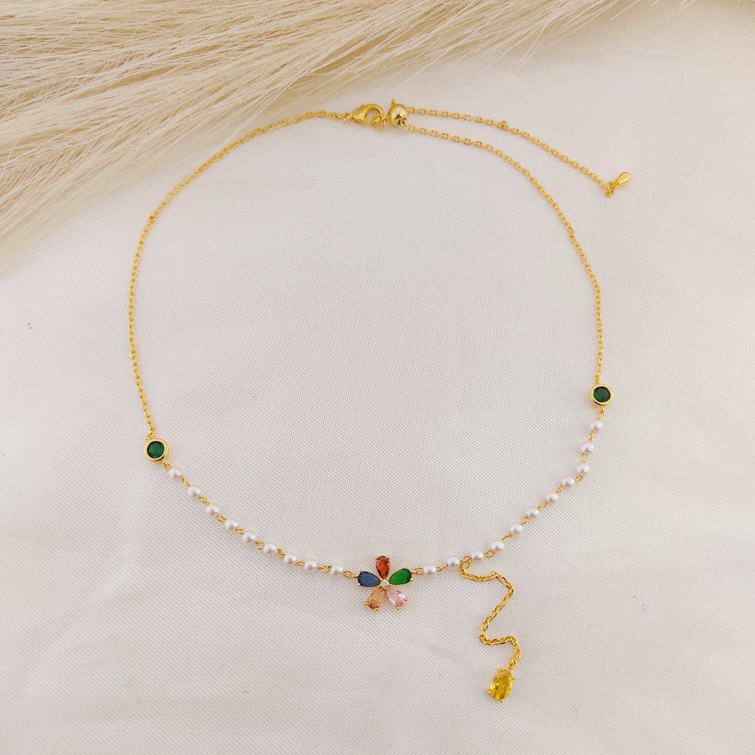 CHOKER CAD PERLAS CENTRO FLOR CIRCONIAS COLORES CON COLGANTE LATERAL