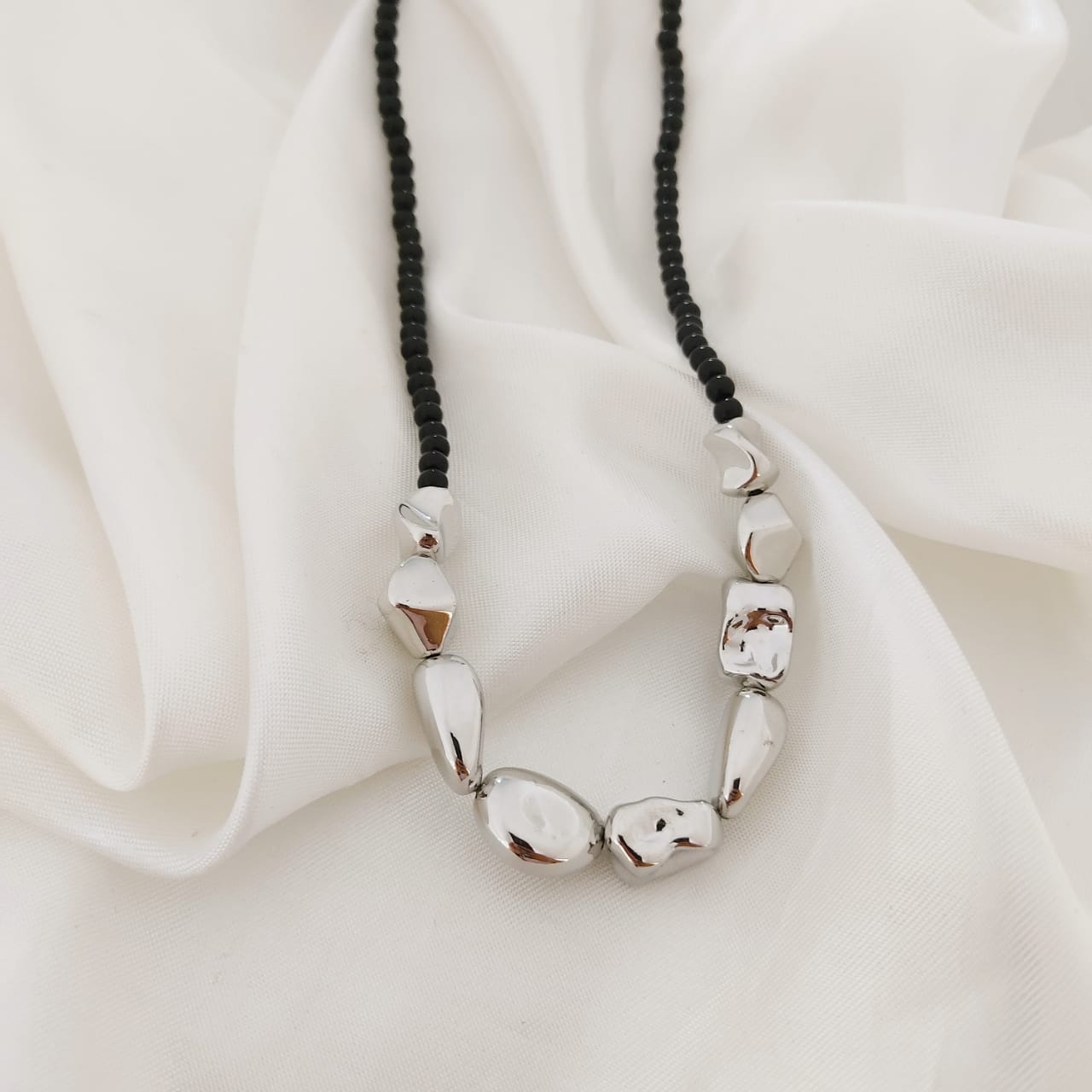 COLLAR ROCAS IRREGULARES PLATA Y BOLITA NEGRAS