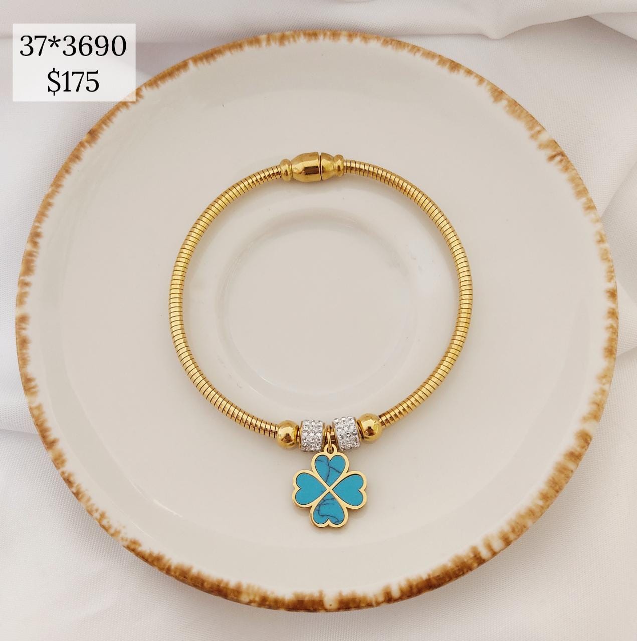 PULSERA ARO IMAN DIJE TREBOL 4 HOJAS TURQUEZA