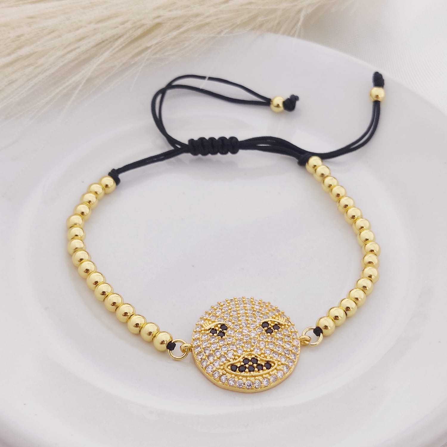 PULSO CARA FELIZ CZ AJUSTABLE BOLITAS HILO NEGRO