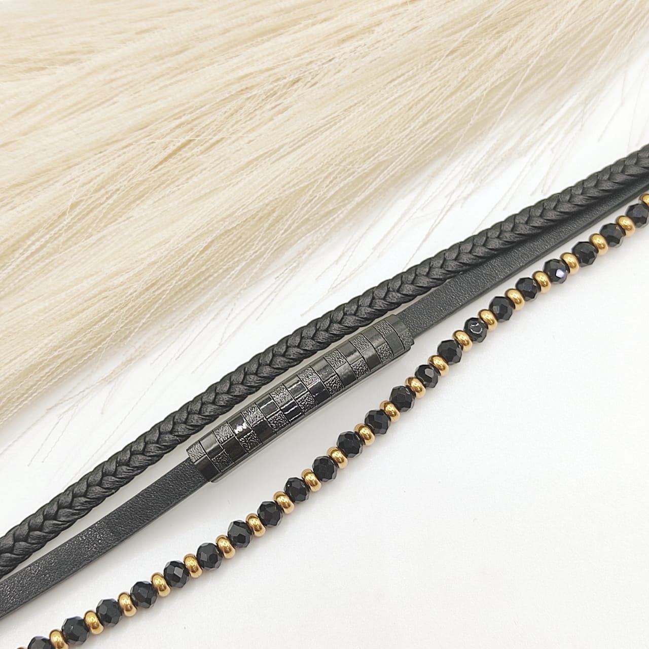 PULSO TRIPLE BOLITAS CRISTALES Y BARA RAYADA DOS TONOS