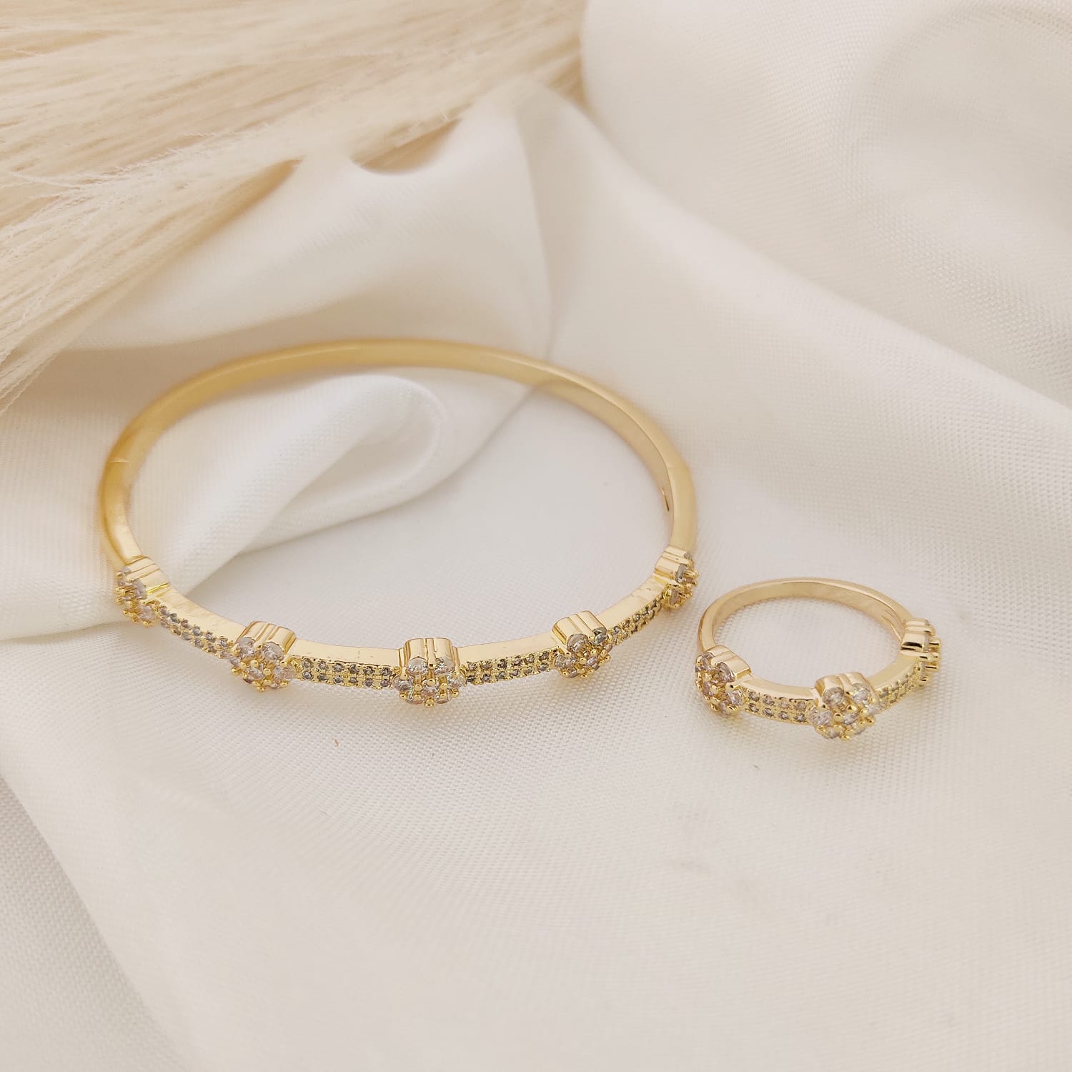 SET ANILLO Y PULSO RIGIDO FLORES CZ SOBRE BARRA BRILLOS